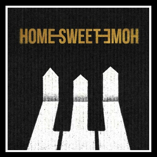 에서는 "HOME SWEET HOME"이라는 문구가 금색으로 강조되어 있으며, 검은 배경과 피아노 건반이 조화를 이루고 있습니다. 이러한 디자인은 음악의 따뜻함과 친근함을 잘 전달하고 있습니다.