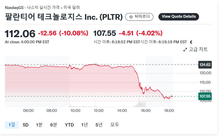 팔란티어의 주가는 최근 몇 주간 급격히 하락했습니다. 특히, 국방부의 예산 삭감 소식이 전해진 이후, 팔란티어의 주가는 하루 만에 10% 이상 하락했습니다. 이는 투자자들이 국방부와의 계약이 줄어들 것이라는 우려를 반영한 결과입니다. 주가는 112.06에서 시작해, 결국 107.55로 마감하며 큰 폭의 하락세를 보였습니다.