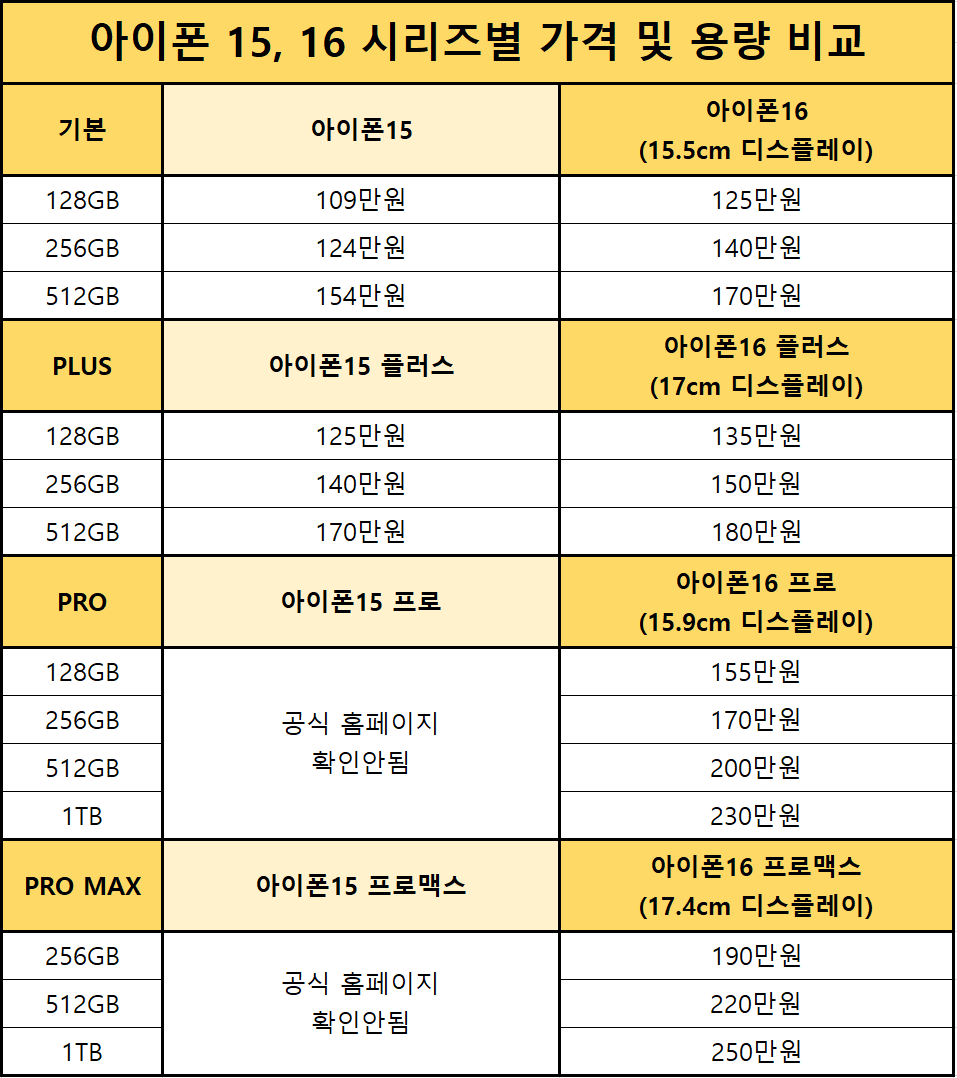 | 아이폰 16 Plus | 6.7인치 | 12MP | 4,000mAh | ₩1,099,000 |