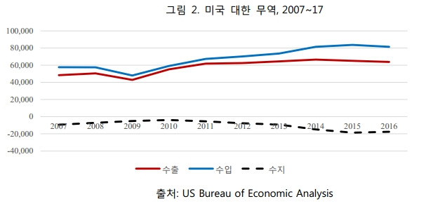 이 그래프는 한미 간의 무역 현황을 보여주며, 양국의 경제적 상호 의존성을 잘 나타내고 있습니다. 특히, 한국은 미국의 주요 무역 파트너국 중 하나로 자리 잡고 있으며, 양국 간의 자유무역협정(FTA)은 이러한 관계를 더욱 강화하는 데 기여하고 있습니다.