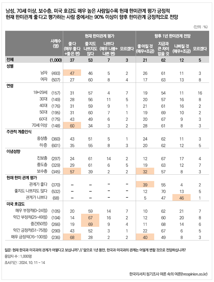 최근 조사에 따르면, 한국인들의 한미 관계에 대한 인식은 긍정적인 편입니다.