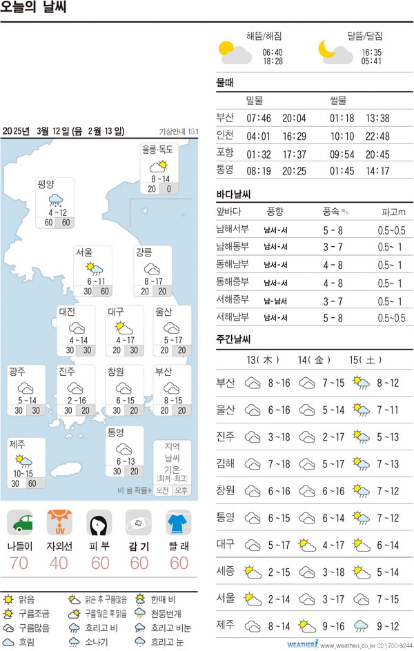 [2] 조선일보 - [오늘의 날씨] 2025년 3월 12일 (https://www.chosun.com/national/national_general/2025/03/12/ZNEP6XHBVRAS7ESC2YRYCZXDJA/)