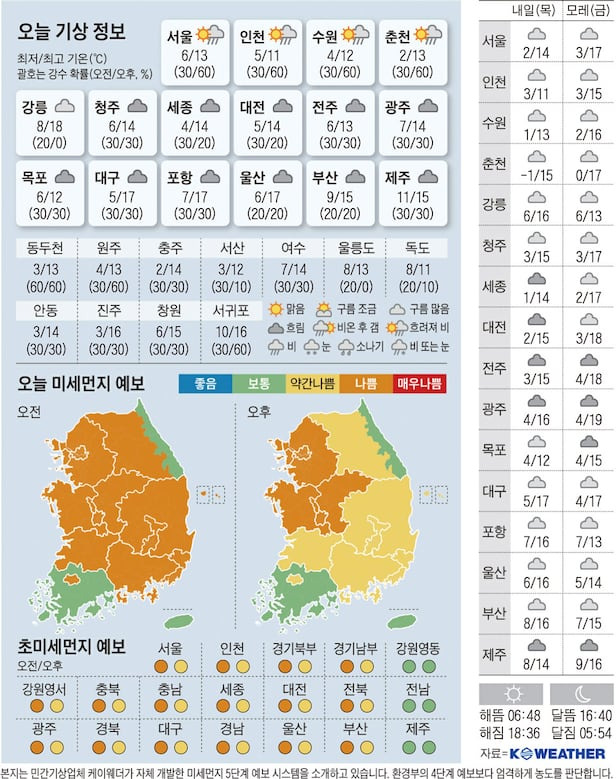 서울, 부산, 인천 등 주요 도시의 날씨는 다음과 같습니다. 서울은 아침에 흐리다가 오후에는 맑아질 것으로 보이며, 부산은 기온이 조금 더 높아 포근한 날씨를 보일 것으로 예상됩니다. 인천은 구름이 많다가 차차 맑아질 것으로 보입니다.
