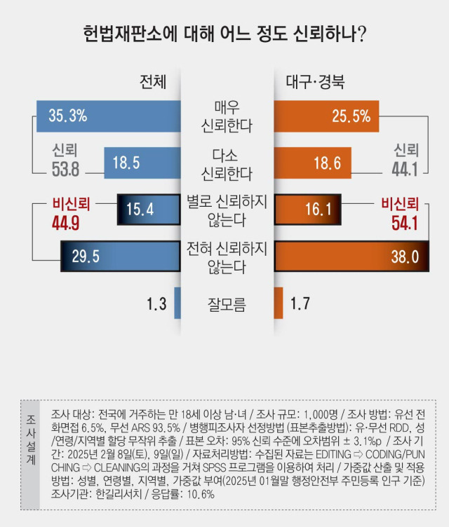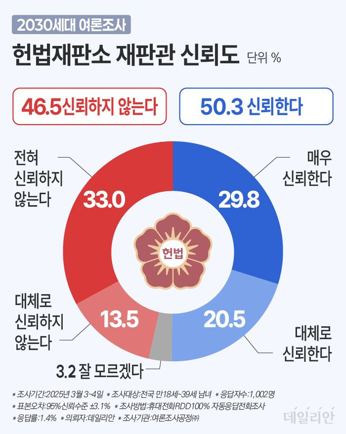 2025년 3월에 실시된 여론조사에 따르면, 헌법재판소에 대한 신뢰도는 50.3%로 나타났습니다. 이는 응답자의 절반 이상이 헌법재판소를 신뢰하고 있다는 것을 의미합니다. 그러나 46.5%는 헌법재판소에 대한 신뢰가 없다고 응답했습니다. 특히, 33.0%는 전혀 신뢰하지 않는다고 밝혔으며, 13.5%는 다소 불신한다고 응답했습니다. 이러한 결과는 헌법재판소에 대한 신뢰가 여전히 낮은 편임을 보여줍니다.