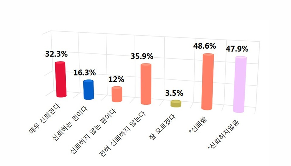 지역별로 헌법재판소에 대한 신뢰도를 비교해보면, 대구-경북 지역의 신뢰도가 44.1%로 전체 평균보다 낮은 수치를 보였습니다. 이는 지역적 요인이나 정치적 환경이 신뢰도에 영향을 미칠 수 있음을 시사합니다.