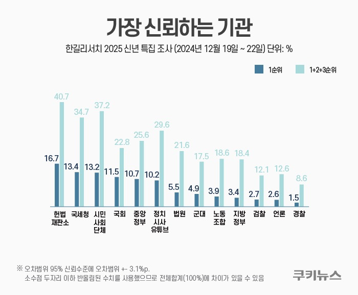 헌법재판소는 최근 조사에서 40.7%의 신뢰도를 기록하며, 국가 기관 중 가장 높은 신뢰도를 보였습니다. 반면, 검찰은 26%로 가장 낮은 신뢰도를 기록했습니다. 이는 헌법재판소가 국민의 신뢰를 얻기 위해 더욱 노력해야 함을 의미합니다.