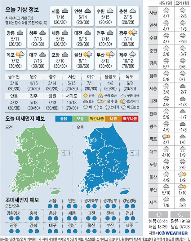 - 서울 : 오늘 서울의 기온은 아침 7도에서 낮 15도까지 오르며, 흐린 날씨가 지속됩니다. 바람이 다소 강하게 불 수 있으니 외출 시 주의가 필요합니다.