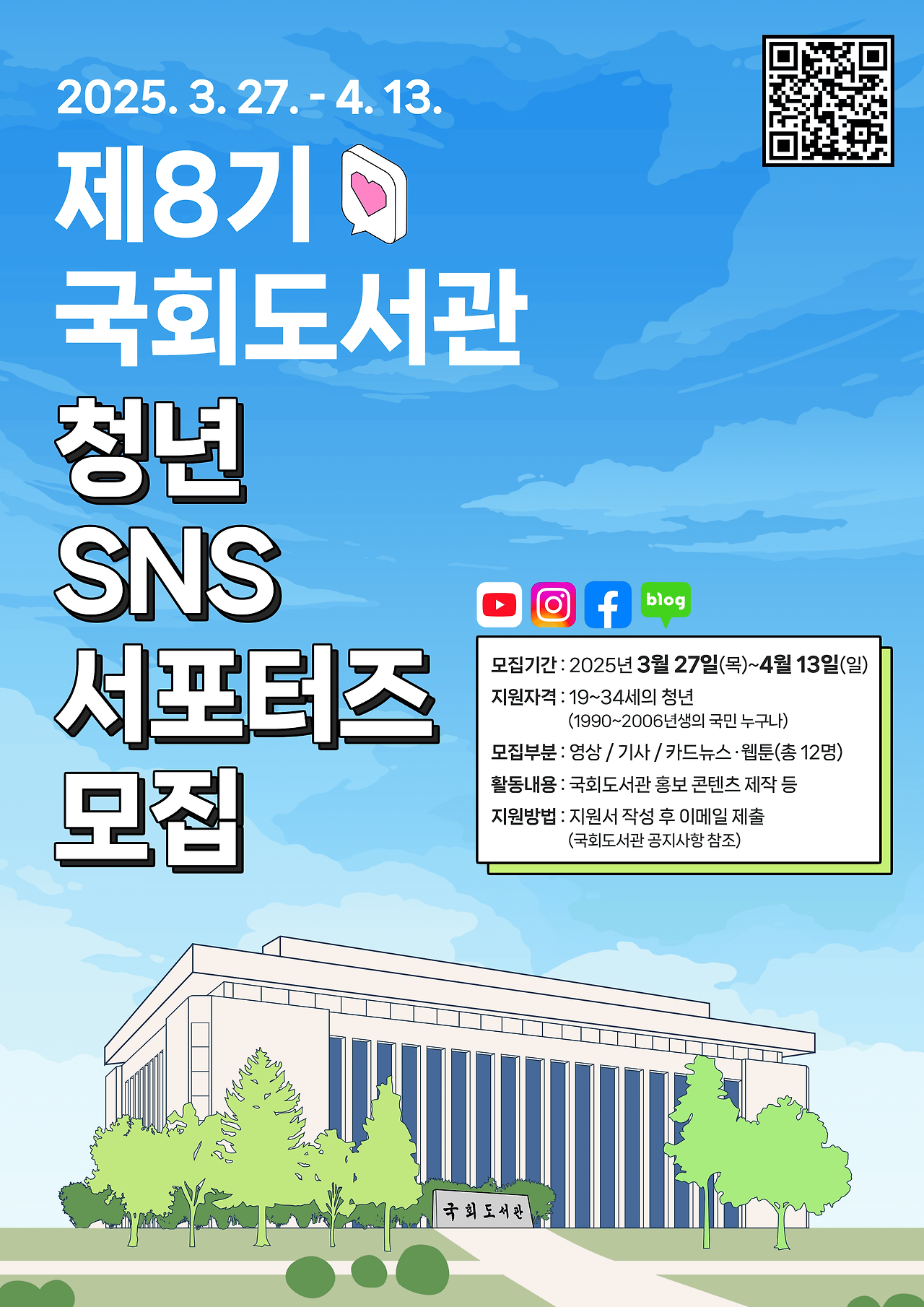 2025년 제8기 국회도서관 청년 SNS 서포터즈에 많은 관심과 참여 부탁드립니다! 여러분의 창의적인 아이디어와 열정이 국회도서관을 더욱 빛나게 할 것입니다. 댓글로 궁금한 점을 남겨주시거나, 이 글을 친구들과 공유해 주세요! 😊