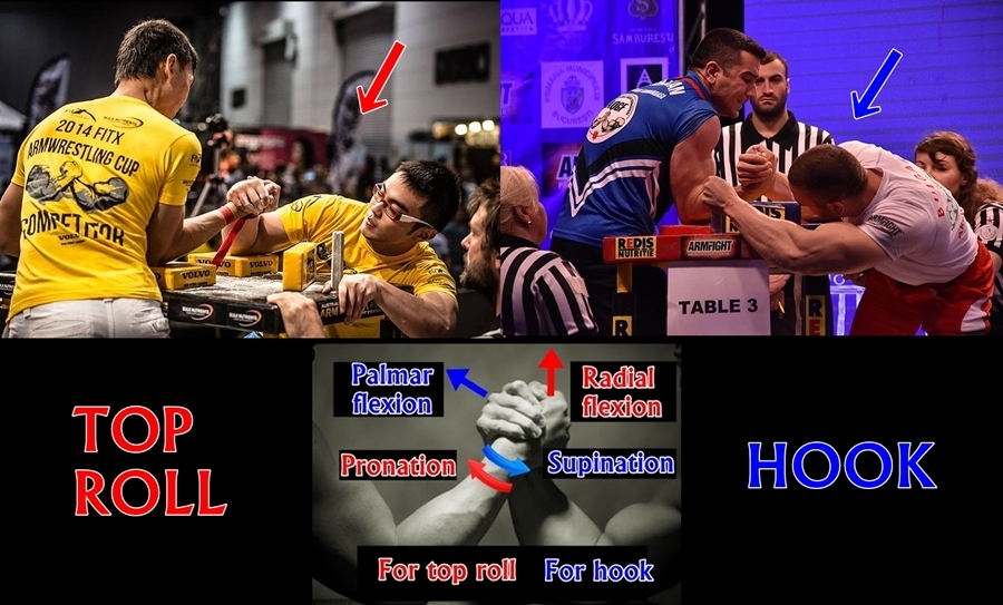 손등이 위로 향하게 돌리는 (프로네이션)을 사용하여 상대방의 손목을 꺾어 넘기는 동작이며, 비교적 전완근의 개입이 큰 기술이다. 기술을 사용했을 때 자신의 엄지와 검지 손가락에 힘이 많이 집중되고, 슬립이라 하는 양손이 서로 풀리는 상황이 자주 발생한다. 때문에 존 블젱크 (John Brzenk)는 팔씨름을 앞두고 송진 가루를 손에 바를 때, 엄지와 검지 및 중지 위주로 바른다고 한 적이 있다. 팔길이의 영향을 비교적 많이 받는 기술이며, 팔이 긴 탑롤러와 경기를하면 엄청나게 불리한것 같은 기분이든다. 탑 롤을 위한 손목 힘 단련법은 사람마다 제각각 다르므로많은 이들이 가내수공업으로 만든 도구를 사용한다(...), 커뮤니티 등지에서 잘 알아보고 실시할 수 있도록 하자.