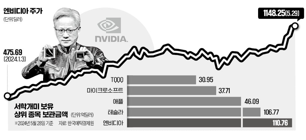 [4] 메트로신문 - [해외주식Click] 서학개미, 엔비디아·테슬라만 2300억 '줍줍'... ... (https://www.metroseoul.co.kr/article/20250429500332)