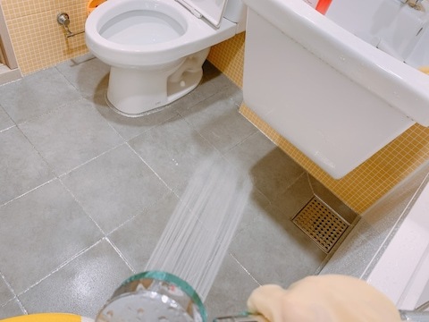 먼저, 욕실 전체에 물을 뿌려 먼지와 이물질을 제거합니다.