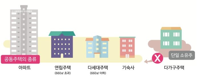 주택은 크게 단독주택과 공동주택으로 나뉩니다. 단독주택은 한 세대가 하나의 건축물 안에 독립된 주거생활을 하는 주택을 말합니다. 반면, 공동주택은 건축물의 벽이나 복도, 계단, 그 밖의 설비 등을 공동으로 사용하는 각 세대가 한 건축물 안에서 독립된 주거생활을 하는 주택을 말합니다.