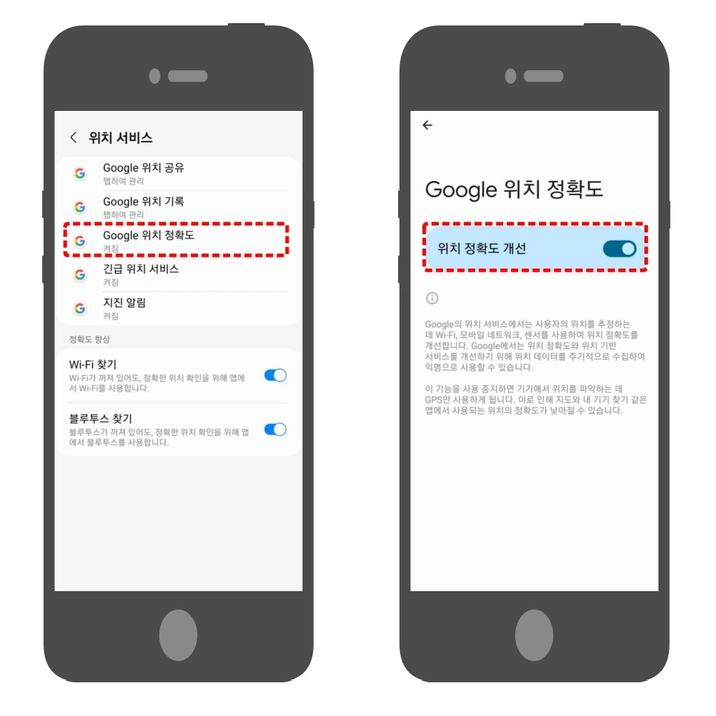 - 위치 정확도 설정 : 위치 정확도를 높이기 위해 Wi-Fi, 모바일 네트워크, GPS를 활용하는 설정을 활성화합니다.