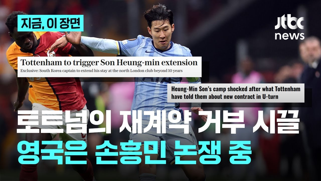 이 이미지는 손흥민의 계약 논의에 대한 헤드라인을 다루고 있으며, 그의 재계약에 대한 기대감을 나타내고 있습니다. 팬들은 그가 팀에 남아 더 많은 성과를 이루기를 바라고 있습니다.