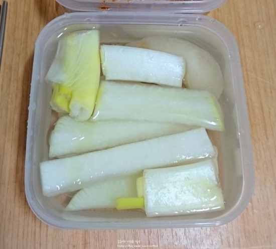 - 재료 담기 : 준비한 무, 대파, 청양고추, 마늘, 생강을 큰 용기에 담고, 소금물을 부어줍니다.