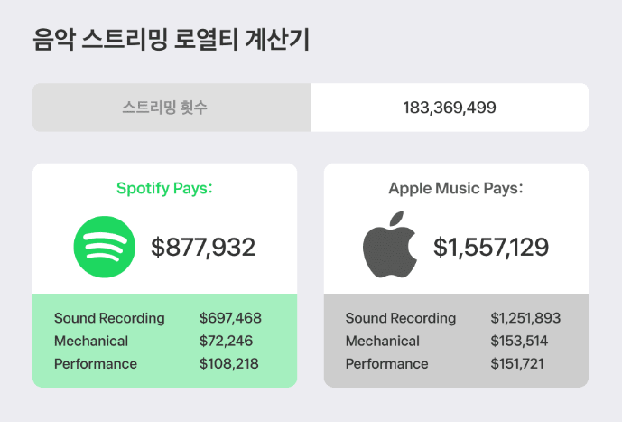 이제 ⟨APT.⟩의 수익을 살펴보겠습니다. 주요 스트리밍 플랫폼에서의 수익 breakdown을 보면, Spotify에서의 총 지급액은 약 877,932달러로, 이는 음원 녹음, 기계적 권리, 공연 권리로 나뉘어 있습니다. Apple Music에서는 총 1,557,129달러의 수익을 올렸습니다. 이와 같은 수익 구조는 아티스트들에게 중요한 수익원이 됩니다.