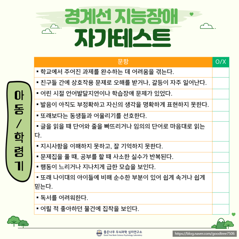 경계성 지능장애를 진단하기 위해서는 전문가의 평가가 필요합니다. 자가 테스트를 통해 자신의 상태를 점검할 수 있는 방법도 있습니다. 예를 들어, 학업이나 사회적 상황에서의 어려움을 평가하는 체크리스트를 활용할 수 있습니다. 이러한 자가 테스트는 경계성 지능장애의 가능성을 확인하는 데 유용합니다.