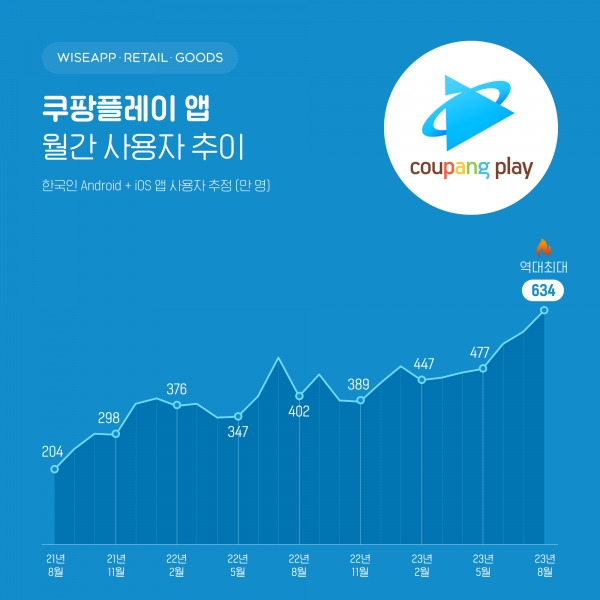 쿠팡플레이는 2024년 10월 기준으로 약 761만 명의 월간 사용자 수를 기록하며, 국내에서 두 번째로 많은 사용자를 보유하고 있습니다. 이는 쿠팡플레이가 출시된 이후 지속적으로 증가해온 결과입니다. 특히, 2021년 8월부터 시작된 사용자 수의 꾸준한 증가세는 주목할 만합니다.