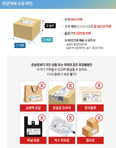 올바른 포장은 반값택배를 이용하는 데 있어 매우 중요합니다. GS25에서는 특정 규격의 박스를 사용해야 하며, 비닐봉지나 봉투는 사용이 금지됩니다. 포장 시에는 물품이 안전하게 도착할 수 있도록 충분한 완충재를 사용해야 합니다.