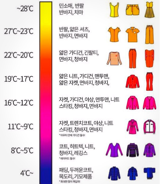 위에서 설명한 내용을 시각적으로 이해할 수 있는 이미지도 함께 소개합니다. 이 이미지는 각 온도대에 맞는 옷차림을 한눈에 볼 수 있도록 도와줍니다.