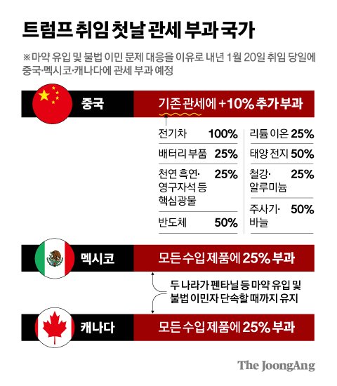 [1] 동아일보 - 트럼프 '관세폭탄' 현실화…“취임 첫날 멕시코·캐나다 제품에 ... (https://www.donga.com/news/Inter/article/all/20241126/130502605/1)