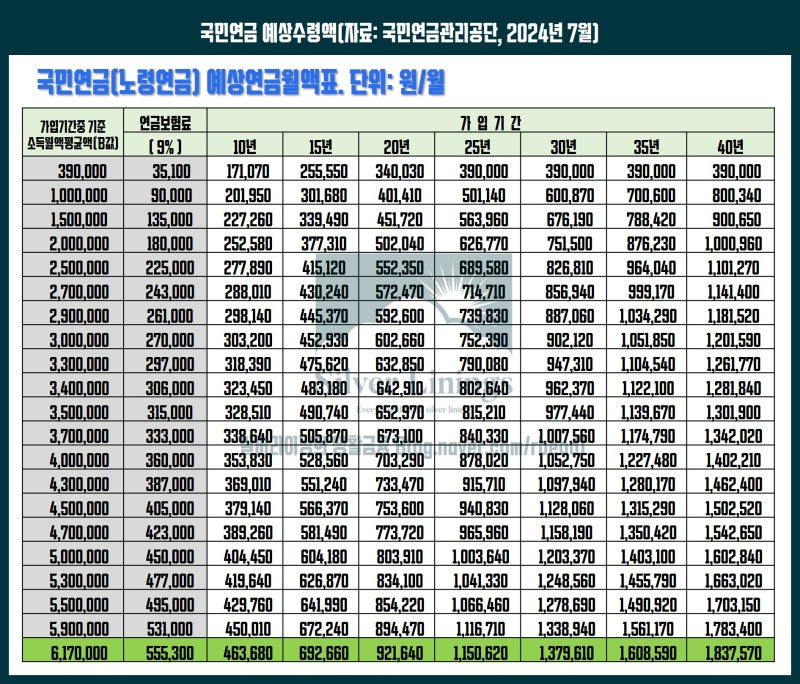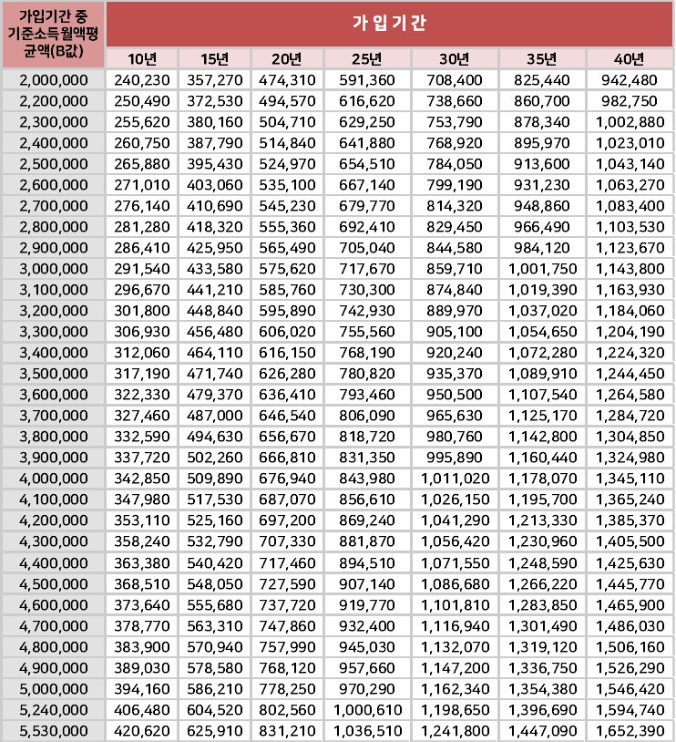 2024년도 국민연금 예상수령액 표