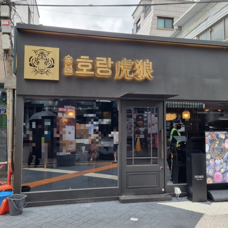 이곳의 입구는 큰 유리창으로 되어 있어 내부의 분위기를 엿볼 수 있습니다. 바쁜 도시 속에서 사람들로 붐비는 이곳은 언제나 활기찬 분위기를 자아냅니다. 특히, 금색 간판과 호랑이 로고가 인상적이며, 이곳을 찾는 손님들에게 강한 인상을 남깁니다. 내부는 아늑하고 편안한 분위기로, 친구나 가족과 함께 오기 좋은 장소입니다.
