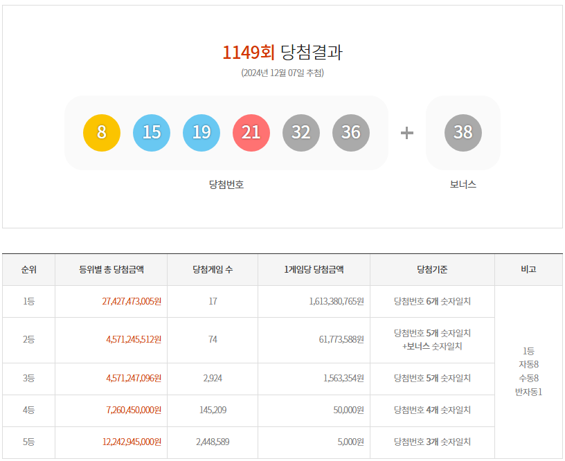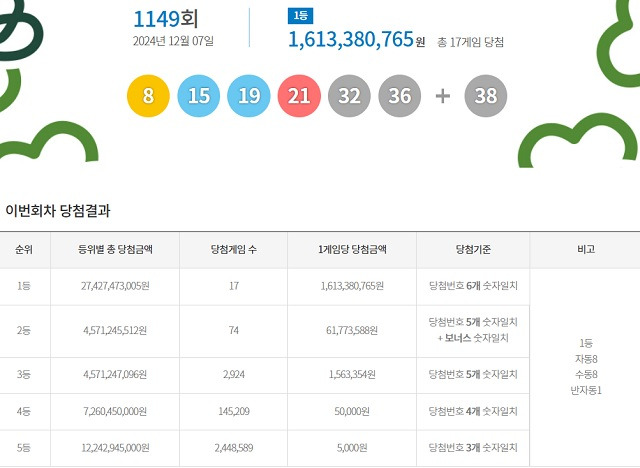 [4] 한국경제 - 1149회 로또 당첨번호 8·15·19·21·32·36…보너스 38 (https://www.hankyung.com/article/2024120715287)