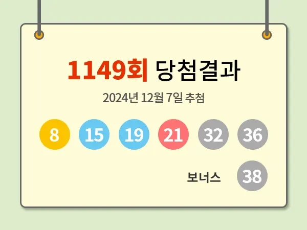 이번 로또 1149회에서 뽑힌 당첨번호는 8, 15, 19, 21, 32, 36 입니다. 보너스 번호는 38 로 결정되었습니다.