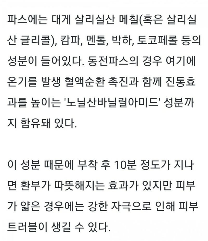 동전파스의 주요 성분은 노닐산비닐아미드, 살리실산, 멘톨 등입니다. 이 성분들은 혈액 순환을 촉진하고 통증을 완화하는 데 도움을 줍니다. 특히, 동전파스는 온열 효과가 있어, 붙인 부위의 혈액 순환을 개선하고 통증을 줄이는 데 효과적입니다.