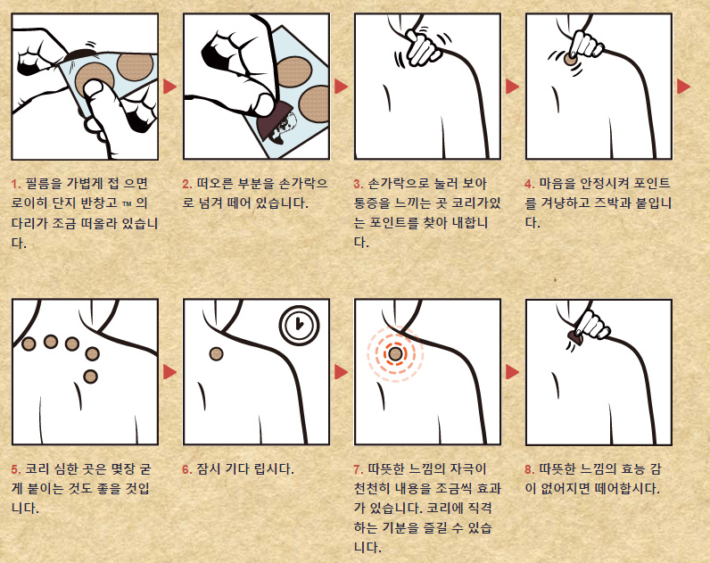 동전파스를 사용하는 방법은 매우 간단합니다. 먼저, 패치의 뒷면을 벗겨내고, 아픈 부위에 붙입니다. 그 후, 약 10분 정도 기다리면 따뜻한 느낌이 들기 시작합니다. 이때, 패치를 너무 오랫동안 붙여두면 피부 자극이 발생할 수 있으니 주의해야 합니다.