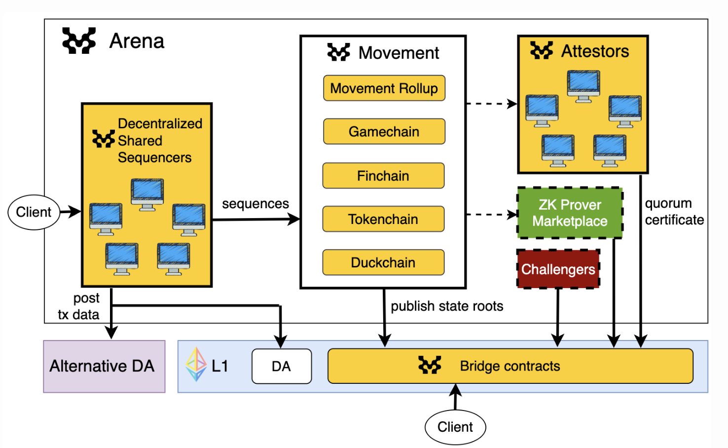 무브먼트코인의 시스템 아키텍처는 여러 구성 요소로 이루어져 있습니다. Arena, Decentralized Shared Sequencers, Attestors 등의 요소가 포함되어 있으며, 클라이언트에서 다양한 체인으로의 시퀀스 흐름을 보여줍니다.