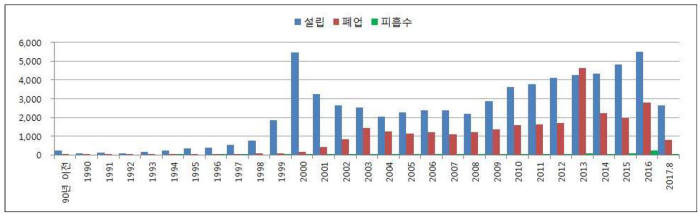 이 그래프는 1990년부터 2018년까지의 설립과 폐업 통계를 보여줍니다. 특히 2000년대 초반에 설립이 급증했으나, 그 이후 폐업률도 함께 증가하는 경향을 보이고 있습니다.
