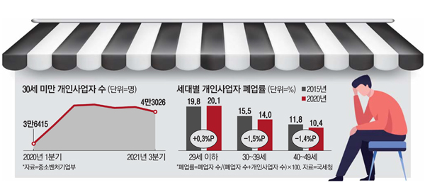 이 이미지는 2020년부터 2021년까지의 30세 이하 개인 사업자 통계를 보여줍니다.