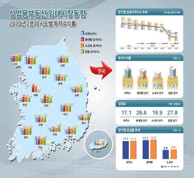이 이미지는 2020년 2분기 상업용 부동산 임대 시장의 트렌드를 보여줍니다.