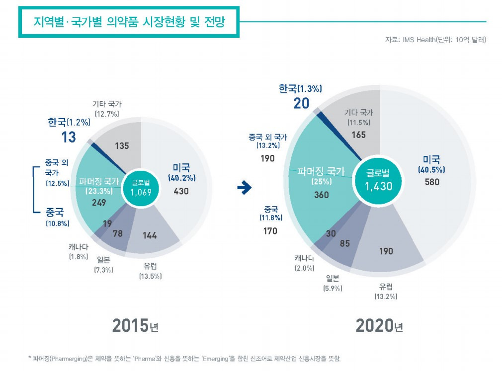 이 이미지는 2015년과 2020년의 제약 시장 비교 분석을 보여줍니다.