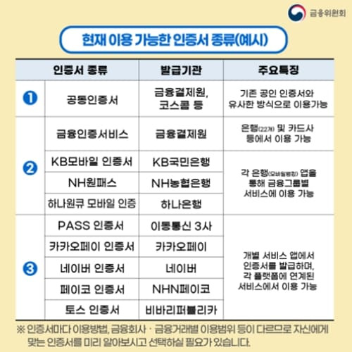 | 공동인증서 | 금융기관 | 온라인 뱅킹 및 카드 거래에 사용 |