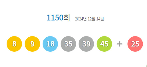 2024년 12월 14일에 진행된 제1150회 로또의 당첨번호는 다음과 같습니다: 8, 9, 18, 35, 39, 45 . 보너스 번호는 25 입니다.
