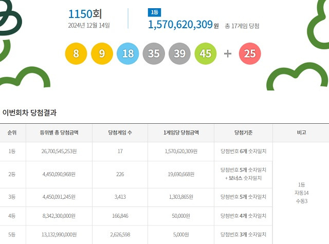 [1] Chosun Biz - 제1150회 로또 1등 당첨자 17명… 당첨금 인당 15억7062만원 (https://biz.chosun.com/topics/topics_social/2024/12/14/WLPOBUY5FFB6JG6ESTTHVUKJ4Y/)