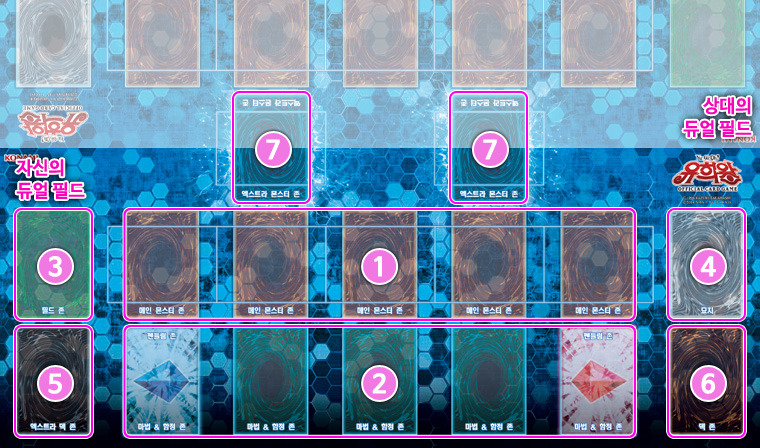 듀얼 필드는 플레이어의 카드가 놓이는 공간으로, 몬스터 카드, 마법 카드, 함정 카드가 각각의 구역에 배치됩니다.