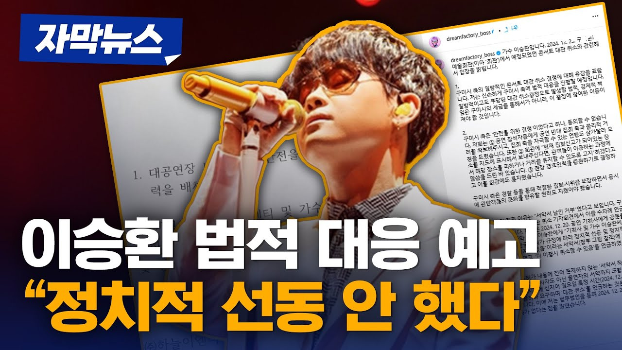 [4] 세계일보 - 이승환 “난 정치적 선동을 하지 않는다”…'콘서트 취소'에 법적 ... (https://www.segye.com/newsView/20241223513143)