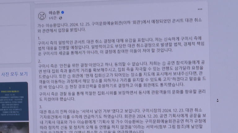 [3] 경향신문 - 이승환, 콘서트 취소한 구미시에 “법적대응 할 것…안타깝고 ... (https://www.khan.co.kr/article/202412231421001)
