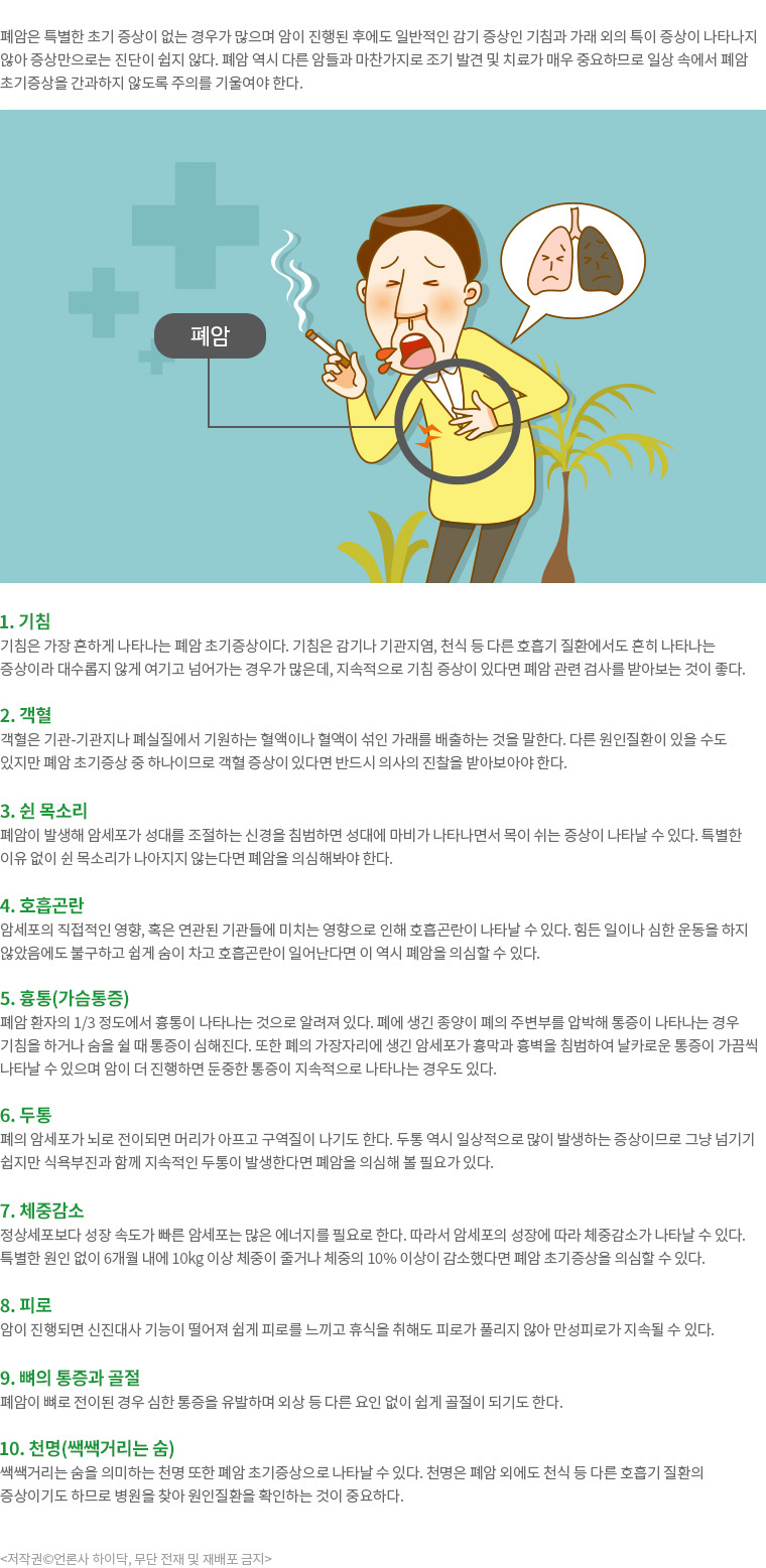 [1] 광양사랑병원 - 일상 속 놓치기 쉬운 폐암 초기증상 10가지 (http://www.gysarang.com/Module/News/Lecture.asp?MODE=V&SRNO=7077)