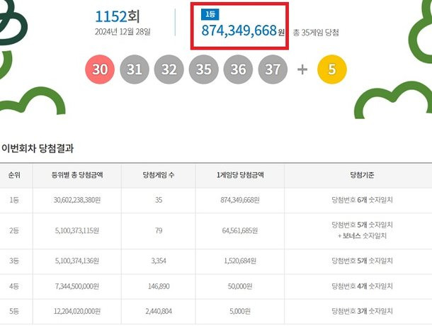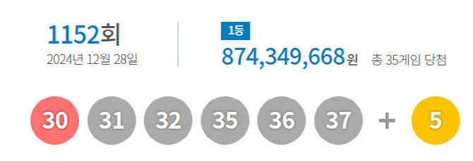 [4] 동아일보 - 1152회 로또 1등 '30, 31, 32, 35, 36, 37'…35명 8.7억원씩 (https://www.donga.com/news/Economy/article/all/20241228/130742995/1)