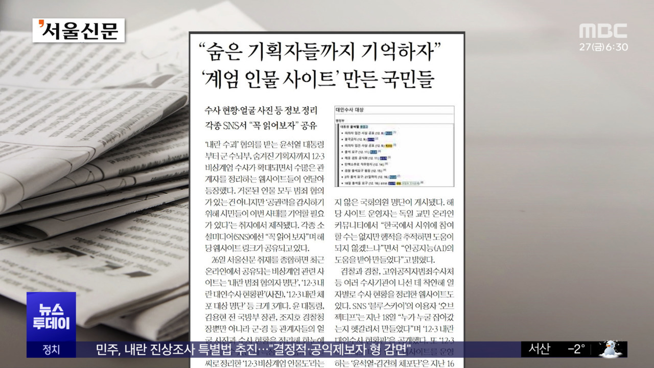 [1] MBC 뉴스 - [오늘 아침 신문] "숨은 기획자들까지 기억하자" '계엄 인물 ... (https://imnews.imbc.com/replay/2024/nwtoday/article/6671141_36523.html)