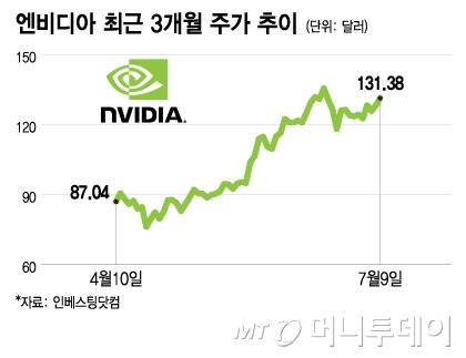 최근 3개월간의 엔비디아 주가 차트를 살펴보면, 주가는 꾸준히 상승세를 보이고 있습니다. 4월 10일에는 약 87.04달러에서 시작하여, 7월 9일에는 131.38달러에 도달했습니다. 이러한 상승세는 엔비디아의 기술력과 시장 점유율 증가에 기인하고 있습니다.