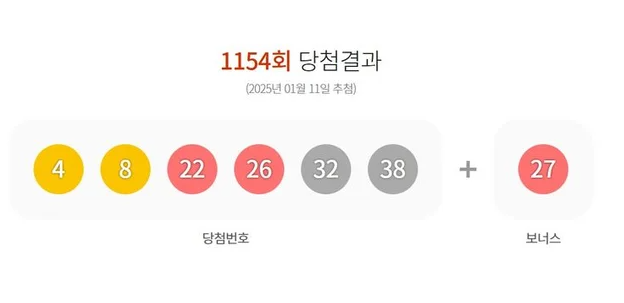 이번 로또 1154회의 당첨번호는 4, 8, 22, 26, 32, 38 이며, 보너스 번호는 27 입니다.