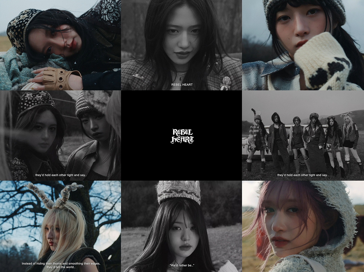 에서는 'REBEL HEART'라는 제목이 중심에 위치하고, 다양한 멤버들의 표정이 담긴 클로즈업 샷이 인상적입니다. 이러한 비주얼은 곡의 주제와 잘 어우러져, 반항적이면서도 예술적인 느낌을 줍니다.