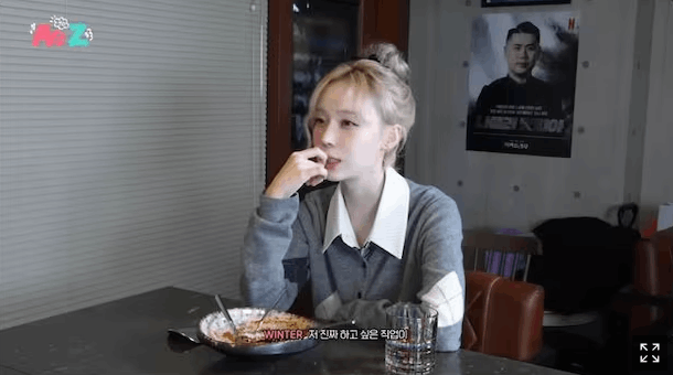 이 사진은 요리 수업 중의 모습으로, 윈터가 집중해서 요리를 배우고 있는 장면입니다.