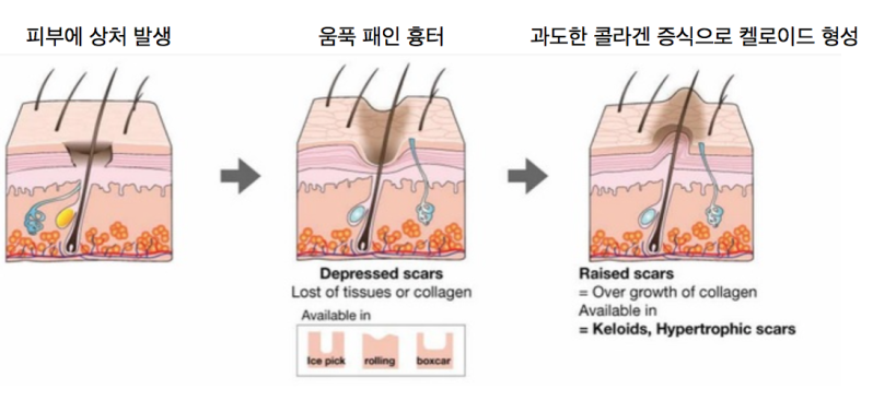 흉터는 피부조직이 손상되어 치유되는 과정에서 생긴 결손부위를 말해요. 즉, 다친 부위가 회복되면서 남는 자국이죠. 예를 들어 넘어져서 무릎에 난 상처나 화상 등 외부 자극으로부터 조직이 손상되었을 때 발생하게 됩니다.